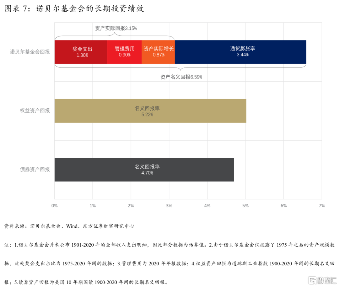 諾貝爾基金會的長期實際年化收益率約為3.15%,成功達成了預設目標。諾貝爾基金會設定的收益率目標為扣除通脹後的總回報率至少為年化3.0%。管理人完成了這一預設目標,諾貝爾基金會的長期名義年化收益率約為6.59%,實際年化收益率約為3.15%,略高於債券的長期回報。