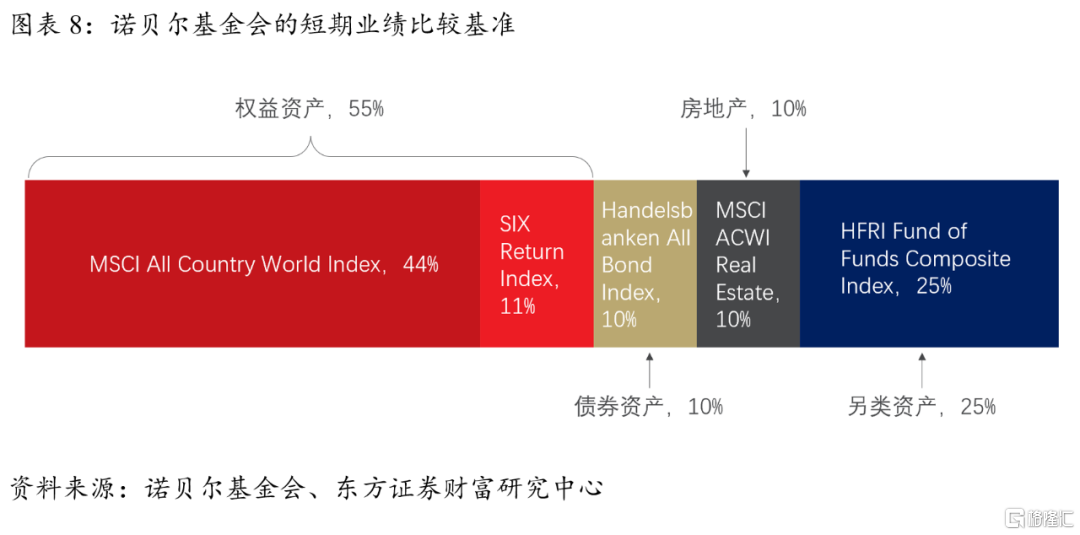 諾貝爾基金會使用的業績基準包括55%的權益資產、10%的債券資產、10%的房地產及25%的另類資產。權益資產中包含44%的MSCI全球指數及11%的SIX收益指數(主要包括瑞典、挪威、丹麥和芬蘭的400餘個成分股)。債券資產為Handelsbanken全債券指數。房地產為MSCI ACWI 房地產指數。另類資產為HFRI FOF綜合指數。