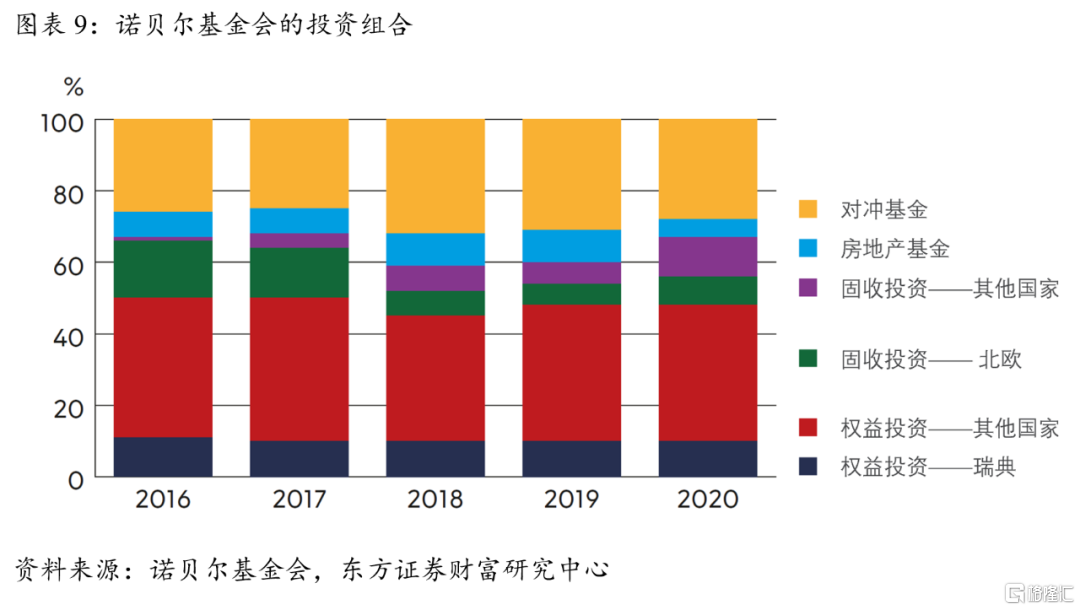 諾貝爾基金會採用多元化的投資組合,權益資產佔比在55%左右。諾貝爾基金會的投資組閤中包括權益資產、固定收益資產、房地產和另類資產。基準投資組合的配置比例設計為55%的權益資產、10%的固定收益資產、10%的房地產和25%的另類資產。同時配置比例允許不同程度的浮動。2020年諾貝爾基金會按投資資本計算的整體組合收益率為8.5%。