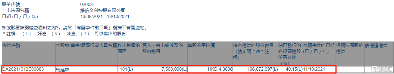 格隆匯APP獲悉,根據聯交所最新權益披露資料顯示,2021年10月11日,維信金科(02003.HK)獲主席及非執行董事馬廷雄在場內以每股均價4.38港元增持750萬股,涉資約3285萬港元。
