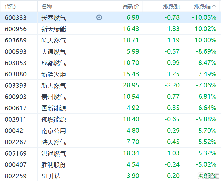 燃氣板塊下挫,長春燃氣、新天綠能、皖天然氣跌停,大通燃氣、成都燃氣跌超8%,新疆火炬、新天然氣跌超7%,貴州燃氣、國新能源跌超6%。