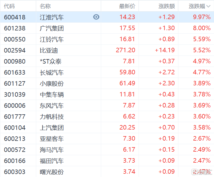汽車板塊大漲,江淮汽車率先封板,廣汽集團漲8%,江鈴汽車、比亞迪漲超5%,長城汽車漲4.77%,小康股份、東風汽車、上汽集團漲超3%。