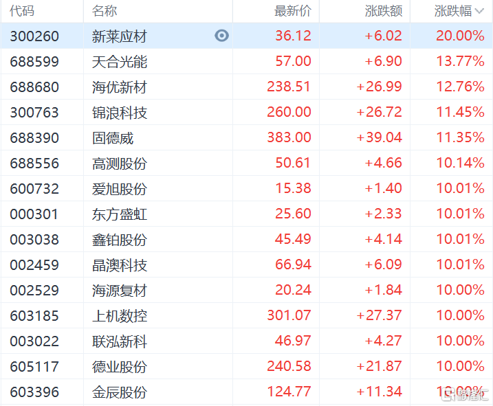 光伏股掀漲停潮,天合光能、錦浪科技、固德威漲超10%,愛旭股份、晶澳科技、上機數控、等多股漲停,隆基股份漲6.47%,陽光電源漲5.6%。