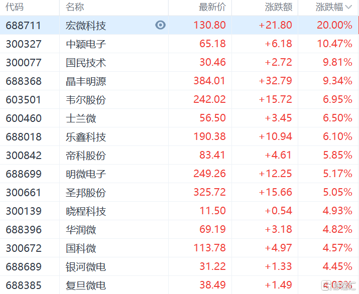半導體板塊走強,宏微科技、中穎電子漲停,國民技術、晶豐明源漲超9%,韋爾股份、士蘭微漲超6%,明微電子、聖邦股份漲超5%。