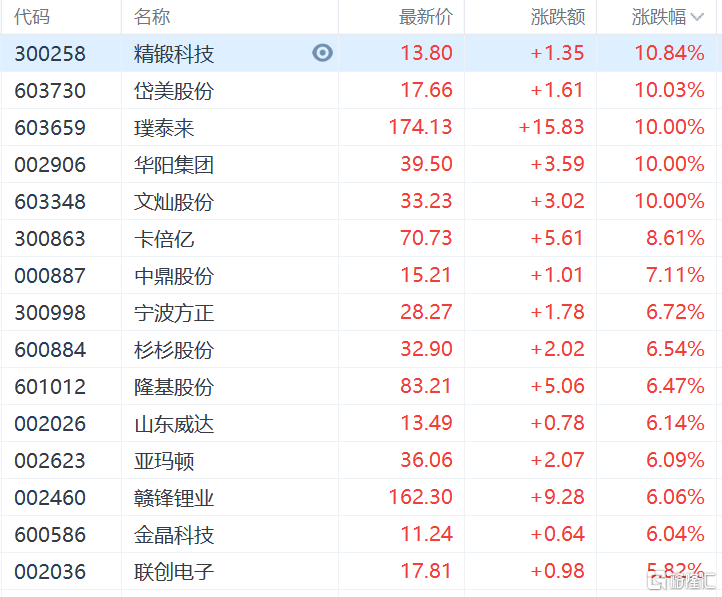 特斯拉概念股大漲,文燦股份尾盤封板,岱美股份、璞泰來、華陽集團等多股漲停,卡倍億漲8.61%,中鼎股份漲7.11%,寧波方正、杉杉股份、聯創電子等漲幅居前。