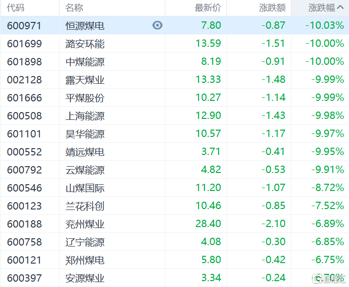 煤炭板塊中,恆源煤電、潞安環能、中煤能源等多股跌停,山煤國際跌8.72%,蘭花科創跌7.52%,兗州煤業、遼寧能源、鄭州煤電跌超6%。