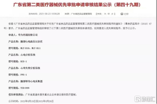 今年10月8日,華爲腕部單導心電採集器獲得了“廣東省食藥監局”的批準,通過了廣東省醫療器械註冊人制度試點批準名單。註冊證號爲:粵械注準20202071705,受託人爲歌爾股份有限公司、濰坊京爲高科電子科技有限公司。