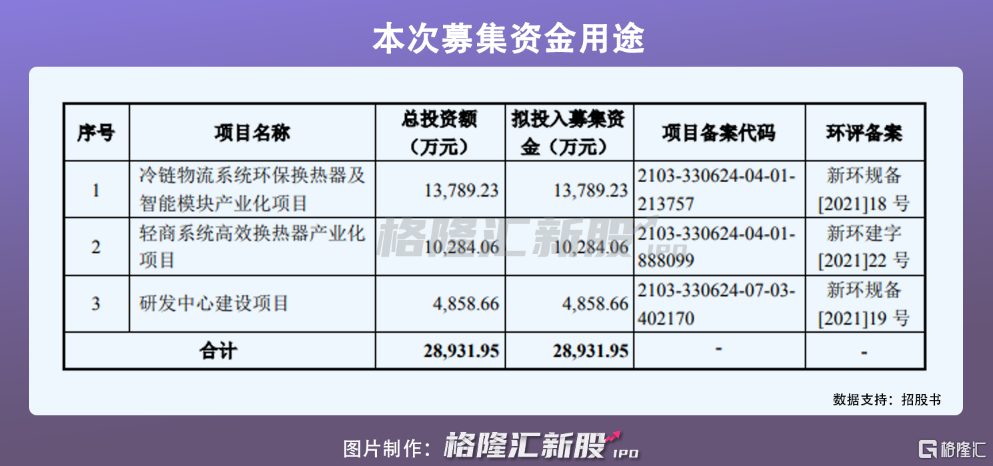 本次IPO擬募集資金2.89億,主要用於冷鏈物流系統環保換熱器及智能模塊產業化項目、輕商系統高效換熱器產業化項目、研發中心建設項目。