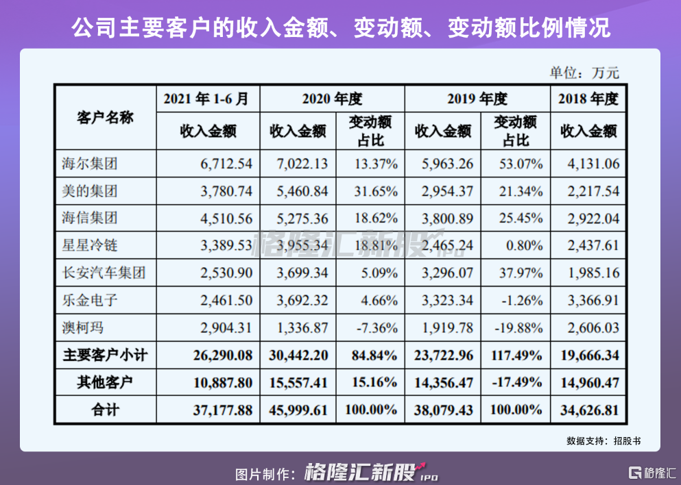 報告期內,公司前五名客戶較爲穩定,部分變動系排名變化導致,主要包括海爾集團、美的集團、海信集團、星星冷鏈、長安汽車集團、樂金電子、澳柯瑪等。公司向前五大客戶銷售金額分別爲1.56億元、1.94億元、2.54億元、2.13億元,佔當期營業收入的比重分別爲 42.38%、46.89%、50.64%、54.20%。公司客戶相對較爲集中,主要系下遊製冷市場終端產品行業集中程度較高,公司主要客戶多爲知名企業所致,這也意味着 ,同星科技需要保持良好的客戶合作關係,一旦出現調整或變動,或會直接對業績產生負面影響。