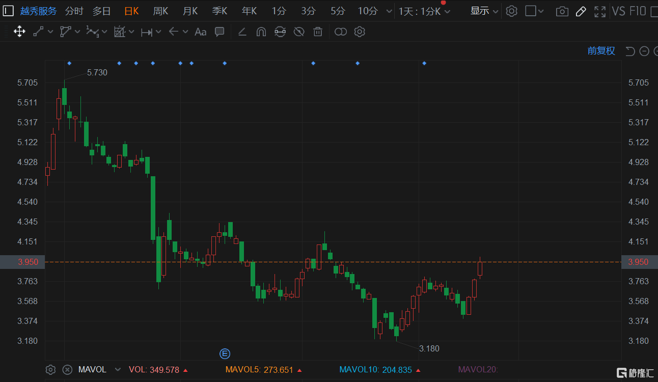 格隆匯10月21日丨越秀服務(06626.HK)續升4.5%,3日連漲達15%。報3.95港元,總市值超60億港元。