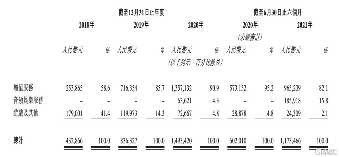 2018年至2021年前六個月止,增值服務實現收入2.54億元、7.16億元、13.57億元、9.63億元,佔總營收比例分別爲58.6%、85.7%、90.9%、82.1%;音頻娛樂服務從2020年開始經營,收入從2020年的6362.1萬元迅速升至2021上半年的1.86億元,佔總營收比例從2020年的4.3%至2021年上半年的15.8%。