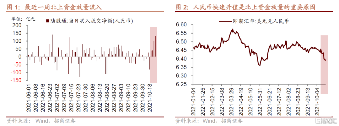 最近一週,北上資金持續放量流入,當週淨流入規模達到233億元,其中後兩個交易日淨流入額均超百億。人民幣快速升值是北上資金放量的重要原因,美元兌人民幣匯率突破6.4大關,在10月22日收於6.3903。