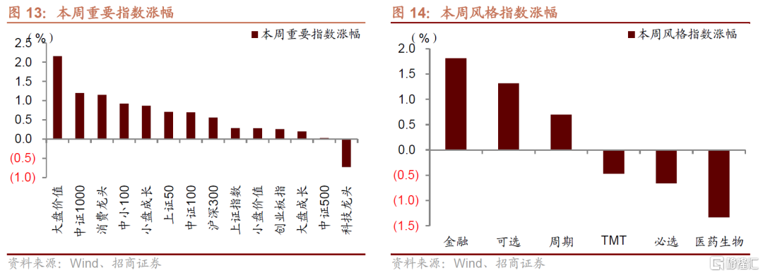 本週A股主要市場指數多數上漲,其中大盤價值、中證1000、消費龍頭指數漲幅居前,科技龍頭指數下跌。從成交上來看,本週日均成交9928億元,日均成交額與上週相比有所放量但依然不足萬億。南向資金本週淨流入港股41.20億港幣,北向資金本週淨流入A股233.03億人民幣。
