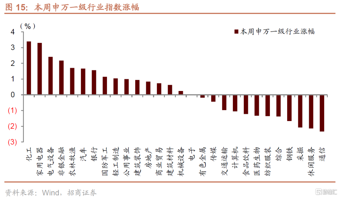 風格的角度來看,行業風格分化較爲明顯,金融、可選風格上漲明顯,醫藥生物風格下跌明顯,大小盤風格方面,本週市場表現出的大小盤風格不顯著。本週申萬一級行業整體多數上漲,共16個一級行業上漲。跌幅居前的行業分別有通信、休閒服務、採掘。近期三季報開啓了密集披露,化工板塊上市公司整體業績高增長。家電板塊主要受港股內房股大漲、估值修復和雙十一開啓帶動。電氣設備由於本週特斯拉公佈的業績超預期,行業景氣度繼續超預期,對A股新能源汽車板塊帶動較爲明顯。跌幅居前的行業方面,採掘行業主要因爲煤炭板塊大跌,發改委連續調控煤價,煤炭期貨連續大跌。