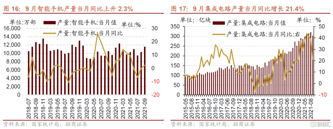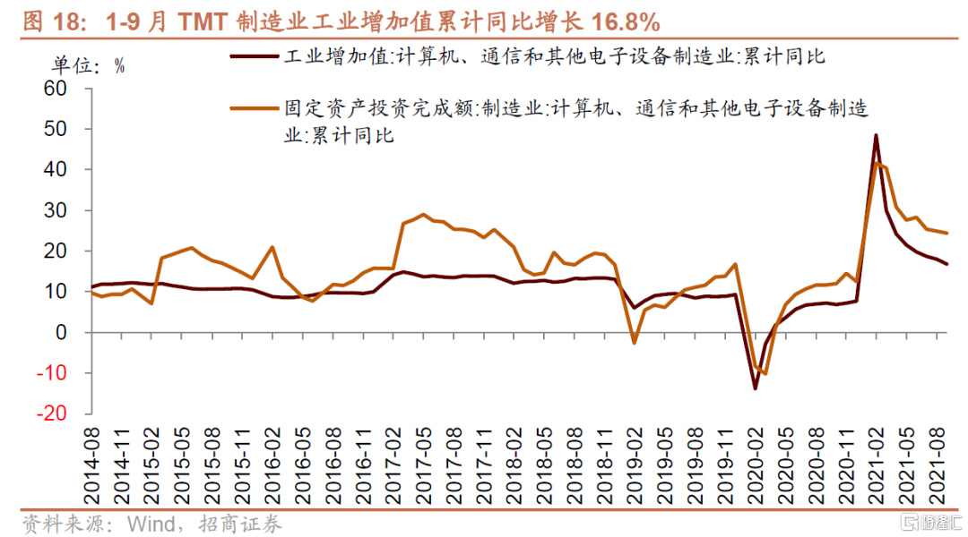 1-9月TMT 製造業工業增加值累計同比增幅收窄。1-9月份計算機、通信和其他電子設備製造業工業增加值累計同比爲16.8%,相比1-8月份增幅收窄1.2個百分點;計算機、通信和其他電子設備製造業固定資產投資完成額累計同比爲24.4%,相比1-8月份增幅收窄0.5個百分點。