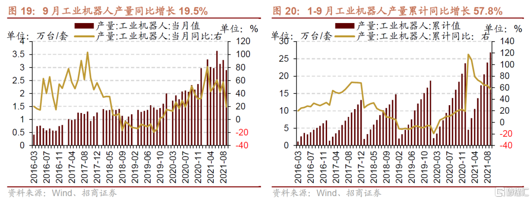 9月份工業機器人產量當月同比增幅收窄。9月工業機器人當月產量29006臺/套,當月同比增長19.50%,增幅較8月收窄37.90個百分點。2021年1-9月工業機器人累計產量爲268694臺/套,同比增長57.8%,增幅較2021年1-8月縮小6.1個百分點,累計產量較2019年同期增長101.16%。