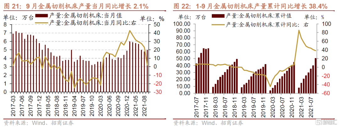 9月金屬切削機牀產量當月同比增幅收窄。9月金屬切削機牀產量爲5萬臺,同比增長2.1%,增幅較上月收窄21個百分點。