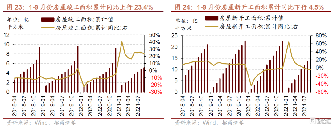1-9月份房屋竣工面積、新開工面積、商品房銷售額、商品房銷售面積累計值同比增幅均收窄。1-9月份房屋竣工面積累計值爲5.10億平方米,累計同比增長23.4%,較前值下降2.6個百分點;1-9月份房屋新開工面積累計值爲15.29億平方米,累計同比減少4.5%,較1-8月份降幅擴大1.3個百分點