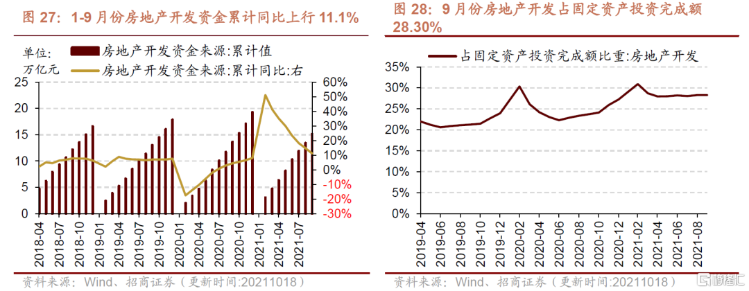 9月份房地產開發佔固定資產投資完成額的比重爲28.3%,1-9月份房地產開發資金來源合計累計值爲15.15萬億元,累計同比增加11.1%,增幅較1-8月份收窄3.7個百分點。
