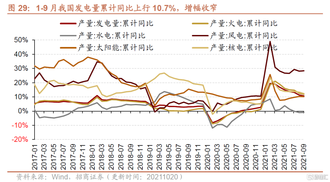1-9月我國發電量累計同比增幅收窄,其中風電累計同比增幅擴大。1-9月份,我國累計發電量60721.0億千瓦時,累計同比上行10.7%;其中火電累計產量43273.0億千瓦時,同比上行11.9%;水電累計產量9030.0億千瓦時,累計同比下行0.9%;風電累計產量4025.0 億千瓦時,累計同比上行28.4%;太陽能產量累計1362.0億千瓦時,同比上行10.2%;核電產量累計3031.0億千瓦時,同比上行12.3%。