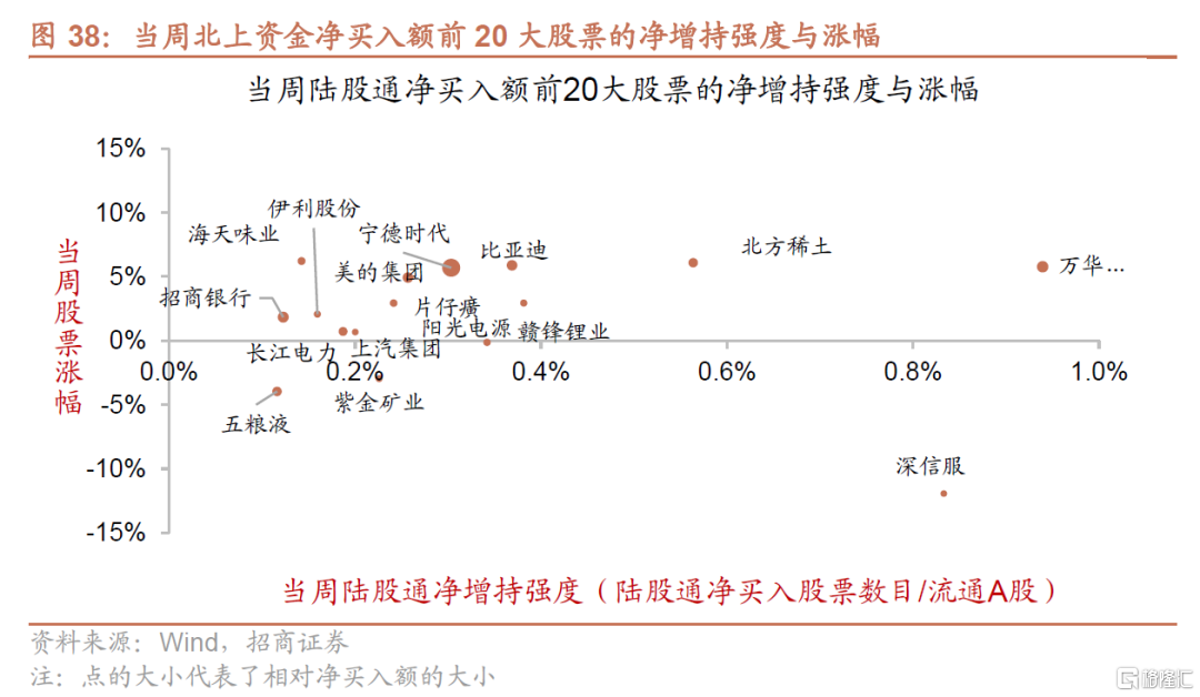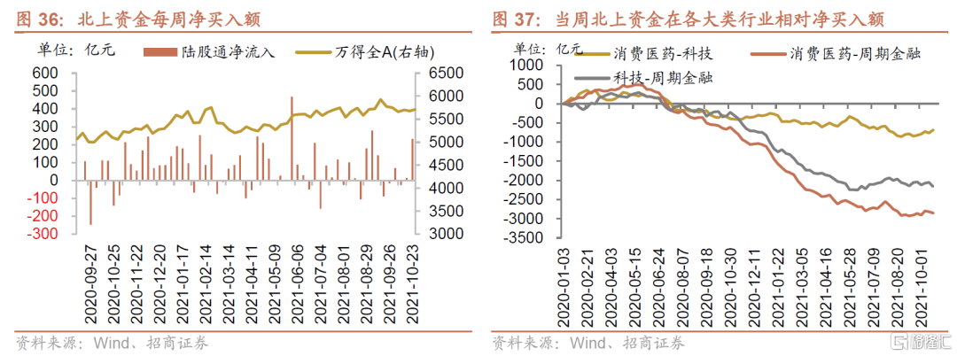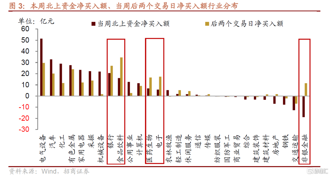 從北上資金的行業流向來看,行業分化仍比較明顯。本週北上資金淨買入額最高的行業包括電氣設備、汽車、化工等,淨買入均達到近30億元或以上。不過周內行業偏好也有所變化,在後兩個淨流入額超百億的交易日裏,北上資金加大了對食品飲料、銀行、非銀金融、醫藥、電子等行業的購買力度,對消費和金融板塊的反彈發揮了帶動作用。