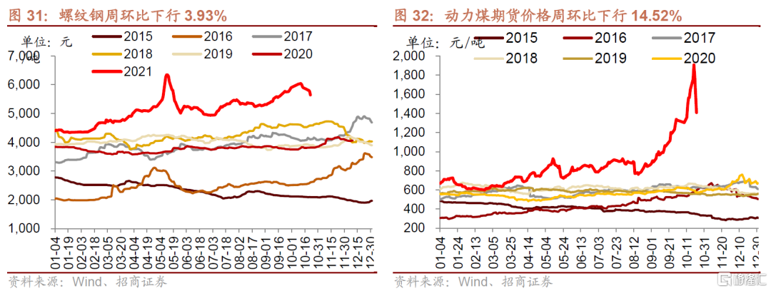 焦炭、焦煤、動力煤期貨價格周環比下降。截至10月22日,焦炭期貨價格周環比下行8.91%至3630.0元/噸;焦煤價格周環比下行15.91%至2986.0元/噸;動力煤期貨價格周環比上行14.52%至1408.4元/噸。