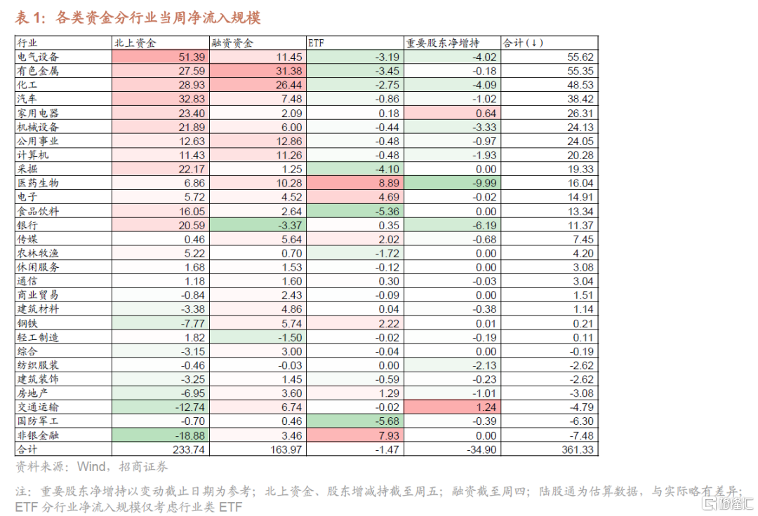 【資金·衆寡】內外資大幅流入,券商&醫藥ETF持續申購。北上資金淨流入233億元;融資資金前四個交易日淨流入近155億元;新成立偏股類公募基金較前期降至18億份;ETF轉淨贖回。行業偏好上,北上資金淨買入較多的爲電氣設備、汽車、化工等;融資資金大幅加倉有色金屬、化工和公用事業;醫藥和券商ETF大幅申購,新能源&智能汽車ETF贖回較多。重要股東二級市場淨減持和計劃減持規模縮小。