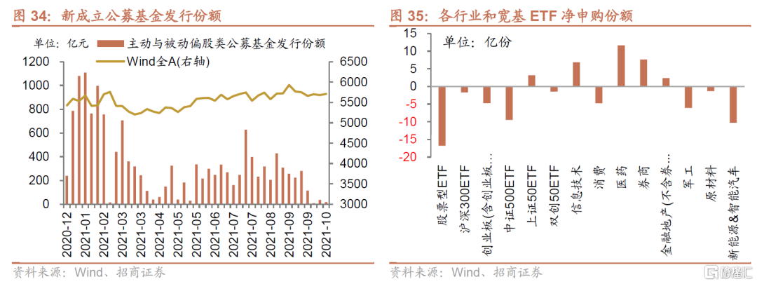 從ETF淨申購來看,ETF淨贖回,寬指ETF以淨贖回爲主,其中中證500ETF贖回最多;行業ETF申贖參半,其中醫藥和券商ETF申購較多,新能源&智能汽車ETF贖回較多。具體來看,股票型ETF總體淨贖回16.8億份。其中,滬深300、創業板ETF、中證500ETF、上證50ETF和雙創50ETF分別淨贖回1.7億份、淨贖回4.7億份、淨贖回9.5億份、淨申購3.2億份、淨贖回1.5億份。行業方面,信息技術ETF淨申購6.8億份;消費ETF淨贖回4.7億份;醫藥ETF淨申購11.7億份;券商ETF淨申購7.7億份;金融地產ETF淨申購2.4億份;軍工ETF淨贖回6.1億份;原材料ETF淨贖回1.3億份;新能源&智能汽車ETF淨贖回10.3億份。