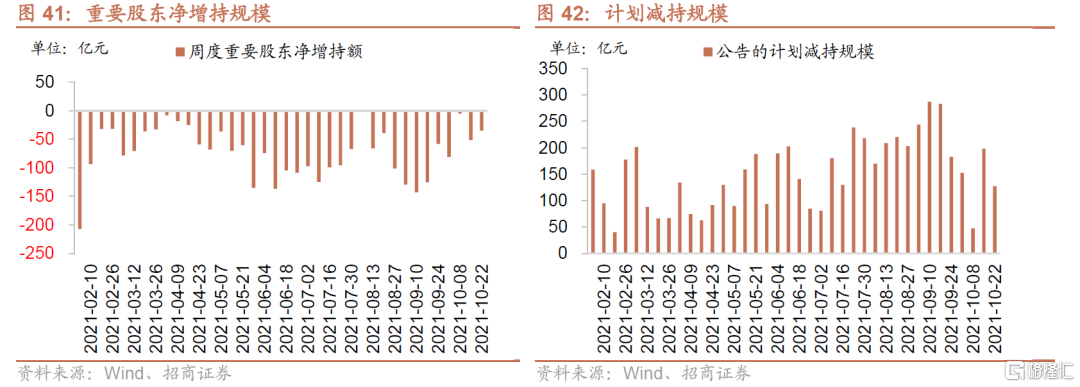 從資金需求來看,重要股東淨減持規模縮小;計劃減持規模下降。本週重要股東二級市場增持3.6億元,減持38.5億元,淨減持34.9億元,淨減持規模縮小。其中,淨增持規模較高的行業包括交通運輸、家用電器、鋼鐵等;淨減持規模較高的行業包括醫藥生物、銀行、化工等。本週公告的計劃減持規模爲127.4億元,較前期下降。