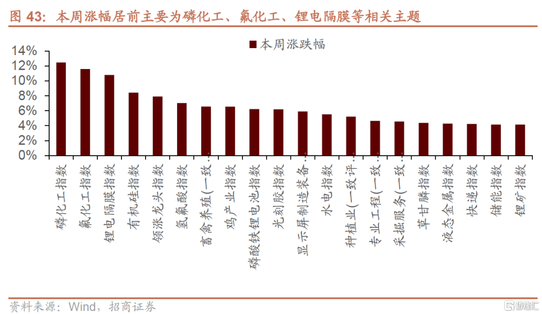 本週市場上漲,Wind全A指數週度上漲0.52%,創業板指上漲0.26%,滬深300上漲0.56%。本週漲幅居前的主要爲磷化工、氟化工、鋰電隔膜等相關主題。
