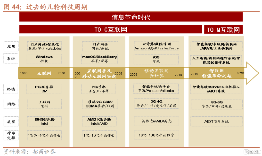 新一輪信息技術革命興起,智聯網成爲下一個突破點。自1990年代以來,歷經傳統互聯網和移動互聯網兩個大的時代後,To C互聯網發展已經相當充分。但是,芯片技術、通信技術還在迭代發展,如果互聯網的界限不再進一步開拓,信息技術革命將會面臨瓶頸。而這個突破點,就是第三代互聯網——to M互聯網。To M互聯網有兩重含義:第一重,指代Machine,也就是機器互聯網,在全球70億居民幾乎已經完成互聯的時代,將千億級別的機器互聯,將會成爲下一代互聯網的核心特徵。當前已經衍生出很多類似的概念,比如物聯網、智能製造、智能家電、智慧城市等等。To M互聯網的第二重含義,M指代“manufacturing”製造業,也就是針對製造業的互聯網,也有稱之爲工業互聯網或者產業互聯網。