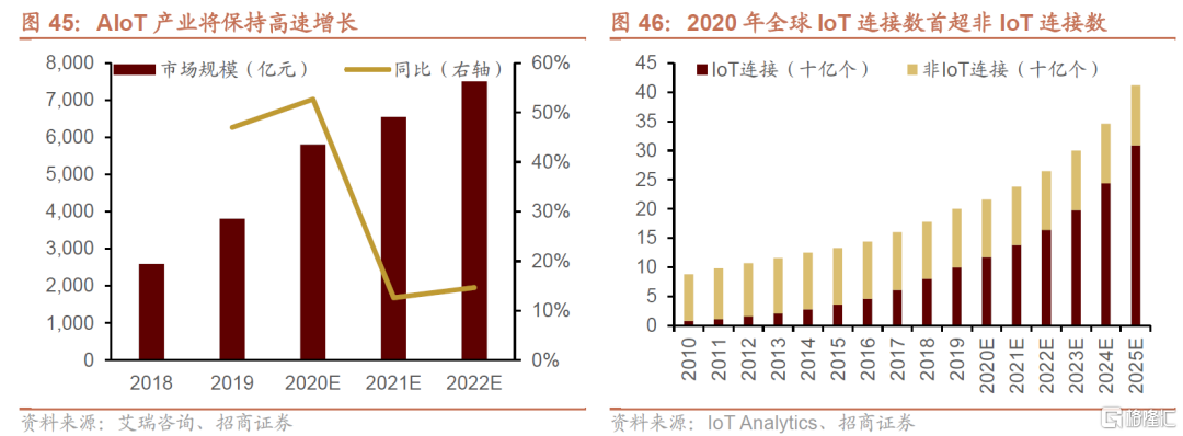 AIoT 市場規模高速增長,預計2022年可達7509億。艾瑞諮詢數據顯示,2019 年中國AIoT 產業總產值爲3808 億元,預計2020 年達5815 億元,同比增長52.7%,高增長主要得益於5G 等新技術規劃化商用和AIoT 應用在消費和公共事業等領域大規模落地。根據IoT Analytics研究,2020年全球物聯網連接數117億個,首次超過非物聯網連接數99億個,物聯網網絡架構逐步完善、數據來源更加豐富,AIoT的發展基礎日益鞏固。未來三年,隨着數字化基礎設施進一步完善,在消費端和政策驅動端應用市場的繼續推動下,AIoT 產業將保持高速增長。