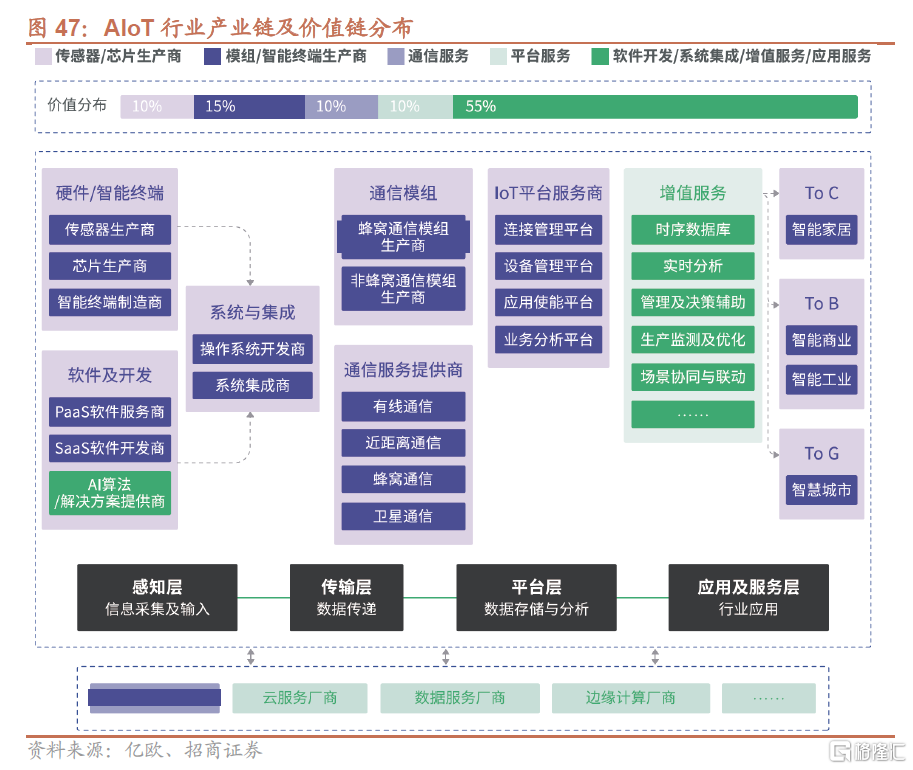 AIoT 產業鏈可以分爲四個層級:感知層、傳輸層、平臺層、應用及服務層。感知層藉助傳感器和芯片等底層元器件採集歸納各類信息,通過通信模組和通信服務提供商構成的傳輸層進行信息傳遞,平臺層對信息進行存儲和分析,在人工智能技術的賦能下,應用和服務層完成對產業鏈下遊的智能化服務。在整個AIoT價值鏈中,硬件和智能終端生產商佔比25%、通信服務佔比10%、平臺服務佔比10%、軟件開發/系統集成/增值服務/應用服務價值佔比55%。AIoT產業鏈相對於IoT產業鏈更強調AI解決方案及平臺,因此產業價值量集中分佈於平臺層和應用及服務層。