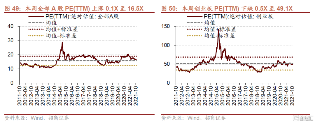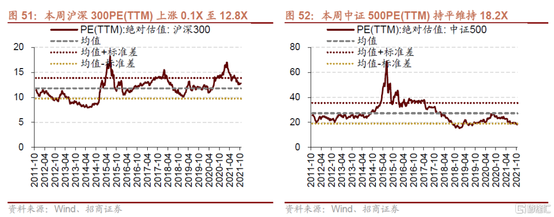 本週全部A股估值水平上行。截至10月22日收盤,全部A股PE(TTM)上漲0.1X至16.5X,處於歷史估值水平的56.0%分位數。創業板本周下行,PE(TTM)下跌0.5X至49.1X,處於歷史估值水平的48.6%分位數。代表大盤股的滬深300指數PE(TTM)本週上行0.1X至12.8X,處於歷史估值水平的69.2%分位數。代表中小盤股的中證500指數PE(TTM)本週持平維持18.2X,處於歷史估值水平的4.9%分位數。