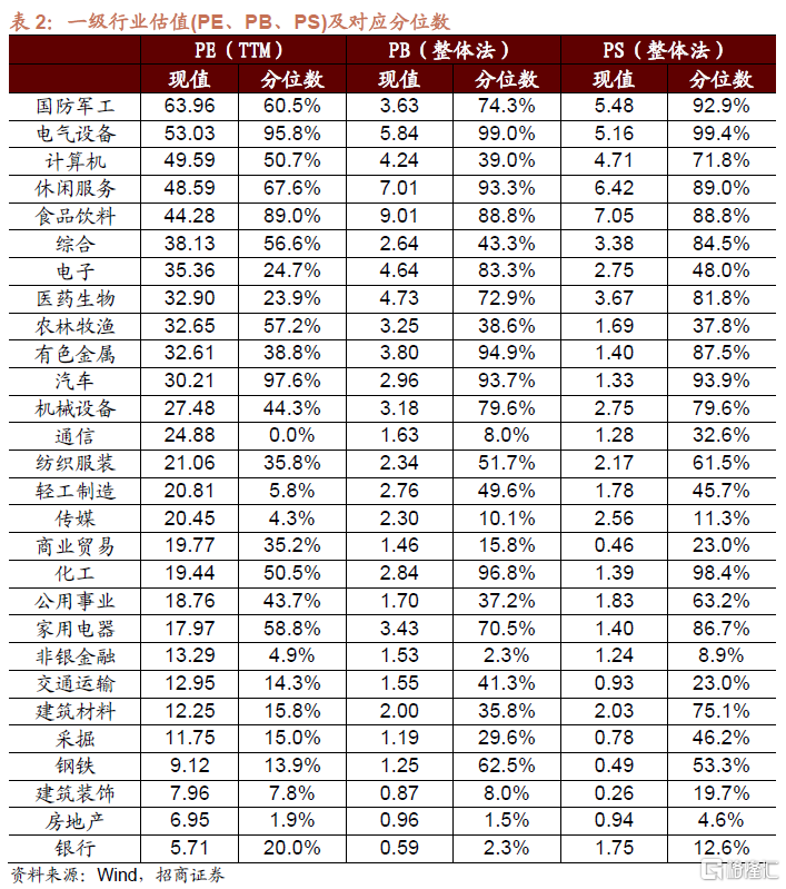 在行業估值方面,本週板塊估值漲跌分化,其中,農林牧漁、電氣設備板塊估值上漲較多,漲幅超過1.0X,有色金屬板塊下跌較明顯,跌幅超過1.0X。其中,農林牧漁板塊上漲7.3X至32.6X,處於57.2%歷史分位;電氣設備板塊估值上漲1.3X至53.0X,處於95.8%歷史分位;有色金屬板塊估值下跌1.4X至32.6X,處於38.8%歷史分位。截至10月22日收盤,一級行業估值排名前五的行業分別是國防軍工、電氣設備、計算機、休閒服務、食品飲料。