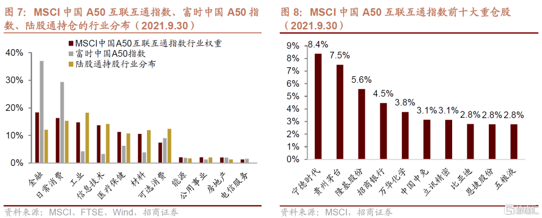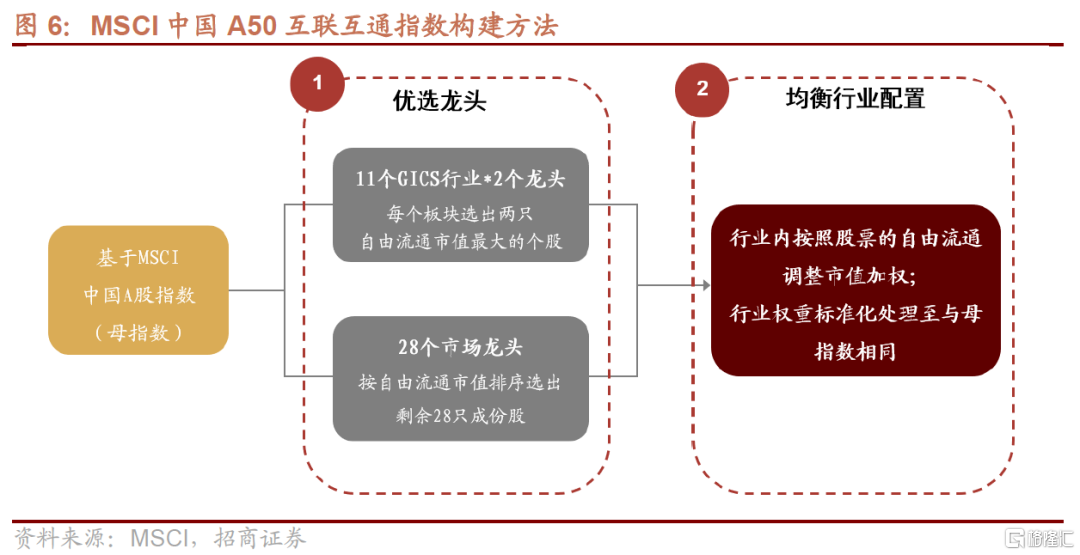 2021年8月20日,MSCI正式發佈MSCI中國A50互聯互通指數,該指數根據MSCI中國A股指數(“母指數”)構建,選擇在滬深交易所上市且可通過北向渠道投資的大型和中型A股,指數旨在反映50只大型證券的表現。根據其計算方法,其中22只成分股按照11個GICS行業板塊均衡分佈,剩餘28只按照市值排序選擇;行業內按照自由流通調整市值加權,不同板塊的權重標準化至與母指數相同的權重。
