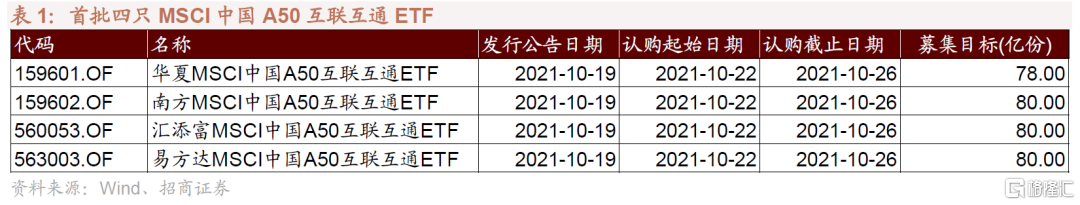 隨着MSCI中國A50互聯互通指數的發佈,匯添富、南方、易方達、華夏四家公司申請並獲準發行首批跟蹤該指數的ETF,首批ETF於10月22日正式發行,發行期爲10月22日爲10月26日。四隻ETF計劃募集規模合計318億元。