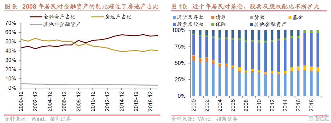 長期以來,房地產是國內居民資產配置的重要組成部分,2008年國內居民對金融資產的配比超過房地產,在此後十多年的時間裏,居民對金融資產的配比不斷提高,其中對基金、股票及股權等權益類資產的配比提升較多。
