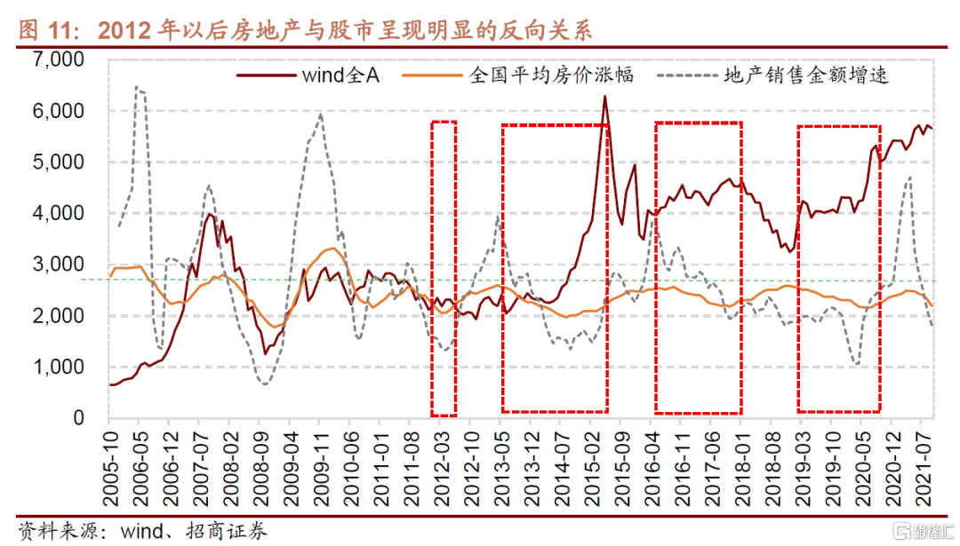 2012年之前,股票市場走勢與房地產成交及價格趨勢基本一致,究其原因,經濟好的時候股票市場表現一般較好,經濟好帶動居民收入改善從而房地產成交情況也較好,由此房價走勢、股價走勢和房地產成交較爲一致。
