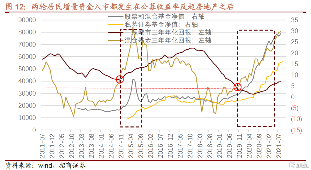 之所以出現房地產市場和股票市場走勢相反,因爲投資者在地產投資(以一線城市房價回報爲代表)和權益投資(以混合基金三年年化回報爲代表)的選擇,而過去兩輪居民資金財富向權益資產大的轉移均出現在一線城市三年年化回報低於混合基金之後。我們發現,這兩次居民資金“搬家”的過程都是公募規模先行大幅擴張,然後纔是私募。我們猜想,公募的門檻較低,所有投資者都可以參與,而私募基金需要大幅擴張,更多依賴高淨值客戶,高淨值客戶的資產調整,需要一定的時間。比如賣房,需要的時間就比較長。當高淨值客戶買的公募開始明顯跑贏地產回報後,投資者開始進行資產類別的調整。