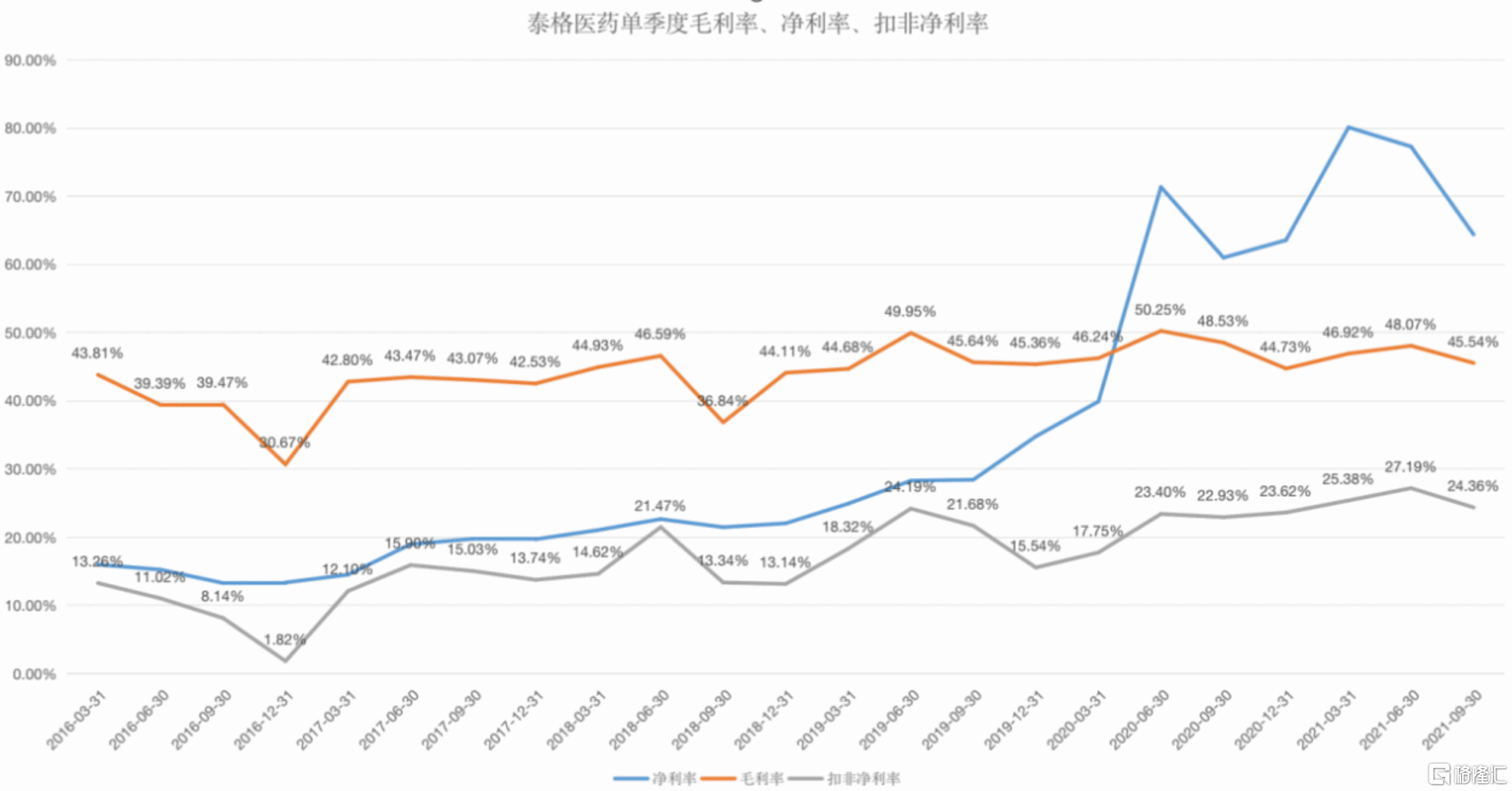 分季度看,公司2021Q3營收13.39億元同比增長+57.77%,2021Q3歸母淨利潤5.26億元同比增長+64.80%,2021Q3扣非淨利潤3.26億元同比+67.63%。扣非增速之所以高於歸母主要系前三季度非經常性損益增速較低所致,2021年前三季度非經常損益約9.12元(+同比11.18%),投資收益及公允價值變動約12.40億元(同比+31.17%)。公司深耕行業多年,每項創新藥企的投資均是在對創新藥行業和自身能力充分評價後進行的,未來這部分收益有望成爲長期的穩定收入來源,具備持續增長潛力。