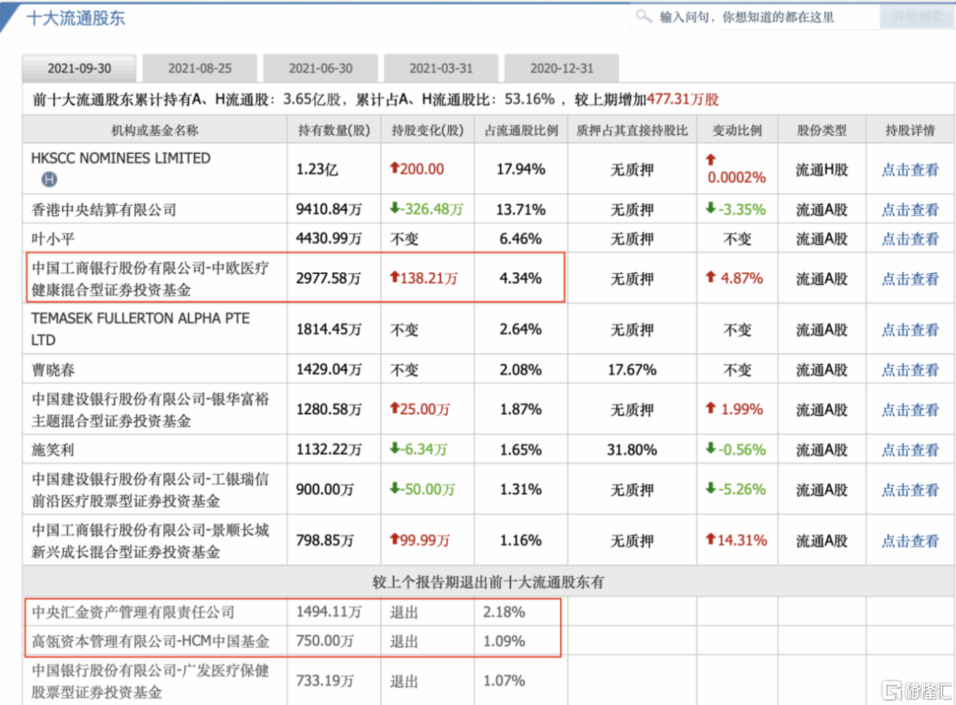 從十大流通股東角度來看,葛蘭管理的中歐醫療健康三季度進行了大筆加倉,而高瓴資本在三季度卻做了相反操作。8月25日公司因回購股份,按要求臨時披露了公司前十大流通股,裏面已沒有了高瓴資本的身影。8月25日,公司第十大流通股東持有698.86萬股,小於高瓴資本二季度末持有的750萬股,可見高瓴已做減倉。