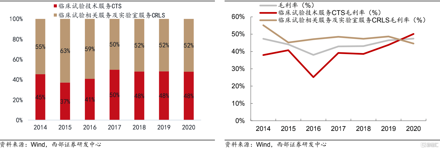 公司目前業務已涵蓋醫藥產品從研發到上市的全過程,可分爲臨牀試驗技術服務(CTS)、臨牀試驗相關及實驗室服務(CRLS)兩大業務板塊。CTS與CRLS協同發展,維持整體毛利率相對穩定。下圖爲公司 CTS、CRLS 兩大業務板塊收入佔比以及公司 CTS、CRLS 兩大業務板塊毛利率變化情況。