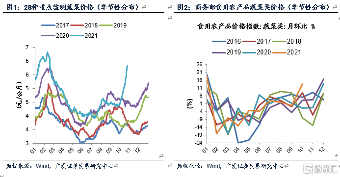 蔬菜價格具有較強的季節性特徵。整體而言,5-6月春季蔬菜集中上市,通常對應全年蔬菜價格的底部區間;7-9月高溫雨季、疊加南方颱風等季節性因素增多,流通環節受限推動蔬菜價格上升;10-11月山東壽光、河北張家口等北方蔬菜貨源逐步收尾,但南方秋季蔬菜集中入市,菜價多呈現震盪築底走勢。12月至次年2月,露地蔬菜供應結束,設施蔬菜供給趨緊,疊加季節性消費高峯,推升菜價至年內最高;此後受貯藏蔬菜拋售、氣溫回升等因素影響,菜價一般會再度回落至二季度末。因而從季節性特徵來看,10-11月通常對應於下半年菜價二次探底的關鍵時點;而從近五年蔬菜價格月度分佈進行考察,2019年、2020年菜價二次探底時點分別爲9月30日、10月9日,恰好落於10月這一關鍵區間。因此本月蔬菜價格上漲本身即具有內生季節性。