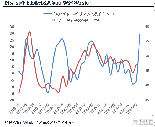 線索七:一般物價還會受到貨幣短週期因素的影響。我們用BCI企業融資環境指數跟蹤貨幣週期,會看到它與農業部28種重點監測蔬菜價格同比之間保持着較好的同週期關係。本輪貨幣和信用週期的企穩預期同步於菜價等一般物價的上行(圖)。