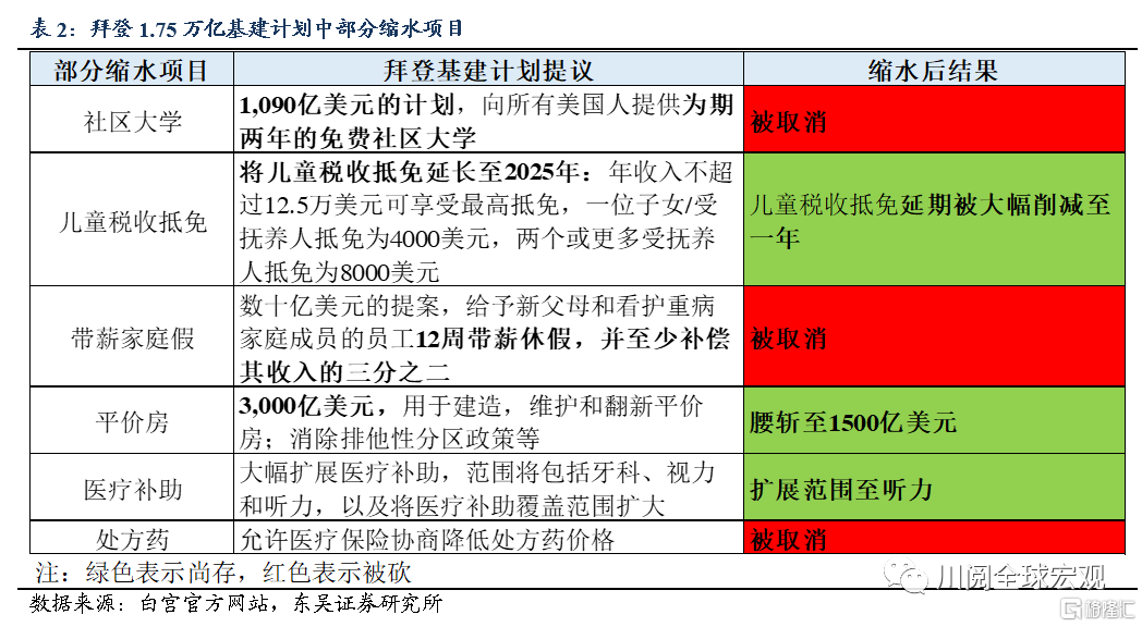 其他存在爭議項目的去留如何?如表2所示,兒童稅收抵免、平價房、醫保擴展等部分被保留,但免費社區大學、帶薪家庭假、調降處方藥價格、醫保擴展到牙科及視力等項目被砍。基建計劃的大幅縮水導致自由派民主黨人的不滿。