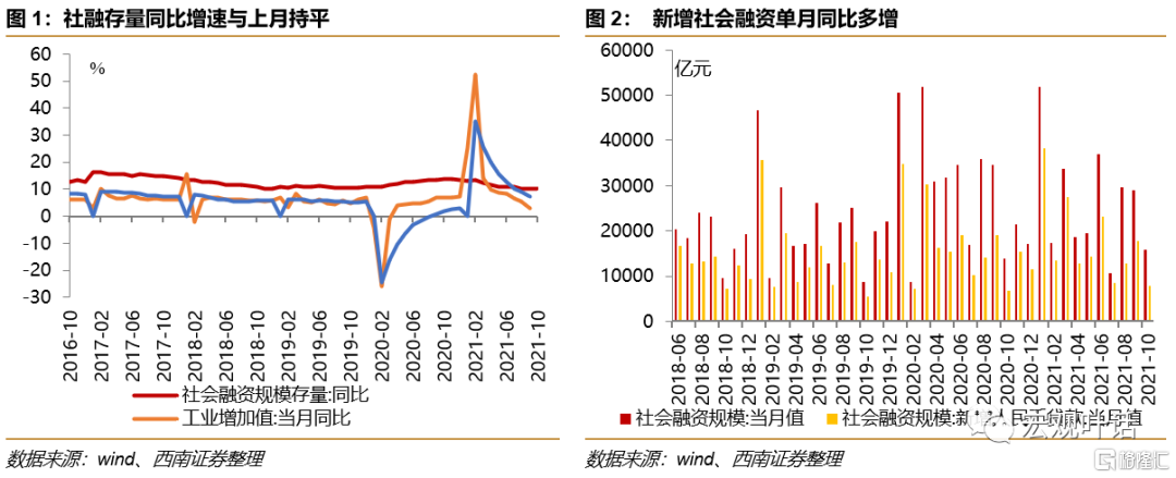 10月,社融增速與上月持平,M2增速回升,新增人民幣貸款略超預期,直接融資佔比受政府債新增增加帶動回升,數據反映企業信心不足,後續貨幣政策仍以穩為主,信貸支持中小企業及製造業、雙碳相關領域,預計社融增速有望反彈。社融存量增速保持平穩,新增社融量不及預期。10月末社會融資規模存量為309.45萬億元,同比增長10%,增速與上月持平,增速邊際下降趨緩與我們之前判斷一致;其中,對實體經濟發放的人民幣貸款餘額為189.2萬億元,同比增長12.0%,增速也與9月一致。從社融增量來看,10月社會融資規模增量為1.59萬億元,受直接融資增多拉動,比上年同期多1970億元,比2019年同期多7219億元,季節因素下環比9月少增1.31萬億元;其中,對實體經濟發放的人民幣貸款增加7752億元,同比多增1089億元,較2019年同期多增2282億元,季初影響下,環比9月少增1.00萬億元。9月底以來,隨着監管層頻頻作出涉及房地產行業表態,並釋放出一定的積極信號,房地產市場的情緒略有回暖,部分地區房貸的放款速度已經加快,局部地區房貸利率有所下調,貸款新增量有所增加;另外,10月新增專項債發行再提速,本月流動性仍較充足。按財政部“新增專項債儘量在11月底前發行完”的要求,預計11月新增專項債發行仍在高位,且9月央行發佈的支小再貸款將繼續發放給符合條件的地方法人銀行,在疊加去年11月後基數逐漸回落,預計社融增速或觸底反彈。