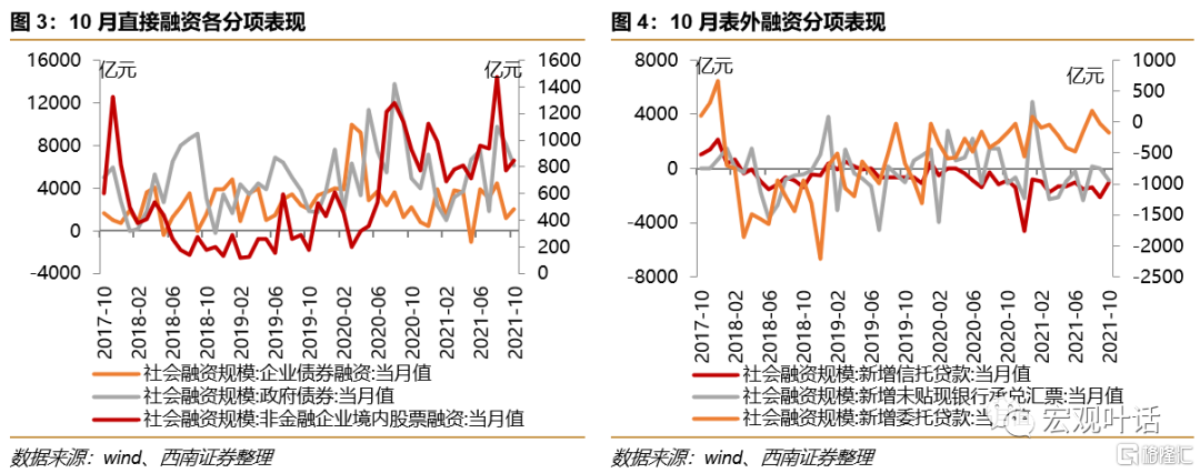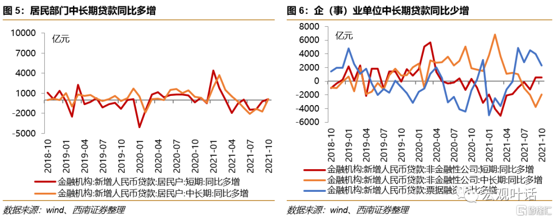 企業票據融資仍高,中長期貸款仍較疲弱。10月,人民幣貸款增加8262億元,略高於預期,同比多增1364億元,季節因素下較前值減少8338億元。分部門看,10月,企(事)業單位貸款增加3101億元,較2020年同期多增910億元。從貸款結構來看,本月企業仍是票據融資新增較多,整體融資需求較穩,10月企業短期貸款減少288億元,同比少減549億元,較2019年同期少減890億元;企業中長期貸款新增2190億元,同比少增1923億元,較2019年同期少增26億元。大宗商品價格維持高位,企業成本壓力和供應短缺壓力仍在,此外部分地區散點疫情也對企業生產造成一定影響,同時能耗雙控影響持續,企業基於諸多因素對投資仍持較謹慎態度,但10月下旬來,國務院和發改委多舉措增加煤炭、電力等市場供應,“保供穩價”促進生產生活,另外10月27日國常會提出對製造業中小微企業緩税2000億元左右,且碳減排支持工具的推出,都或將在一定程度上提振企業信心。此外,票據融資在10月新增1160億元,環比9月份減少193億元,但同比增加2284億元,較2019年多增946億元。後續隨着疫情影響的逐漸消退,企業情緒上升,預計中長期貸款或有所回暖。
