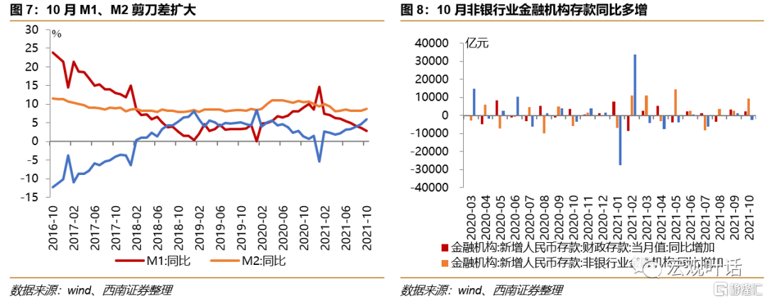 剪刀差繼續擴大,M2增速回升10月末,M2同比增長8.7%,增速較前值高0.4個百分點。人民幣存款同比多增1.16萬億元,其中因10月為集中繳税大月和財政支出小月,財政性存款同比多增2050億元;非銀金融機構存款同比多增9482億元;對前景較謹慎的背景下,非金融企業存款同比少減;假日和購物節推動下,住户存款同比多減2531億元。M1同比增長2.8%,M2-M1的增速差繼續擴大,預計四季度貨幣政策將保持穩健,M2增速或將繼續穩中有升。