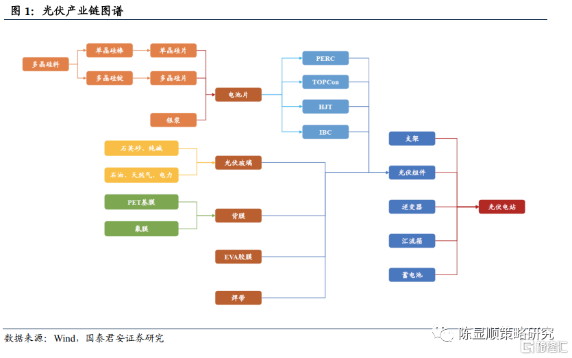 光伏產業鏈主要包括上遊原材料採集加工,中遊電池片組件製造、以及下遊光伏電站建設運營。其中上遊原材料包括硅料、晶體硅以及硅片的加工製造;中遊主要包括電池片和組件的加工製造,電池片是組件的主要構成部分,其他輔件包括光伏玻璃、背膜、EVA膠膜、焊帶等;下遊主要爲光伏電站的建設與運營,輔件包括支架、逆變器、匯流箱、蓄電池等。